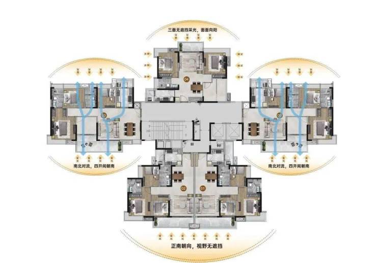 第一,楼栋采用南向点式布局,保证了采光、通风,也让整体空间形态舒朗;