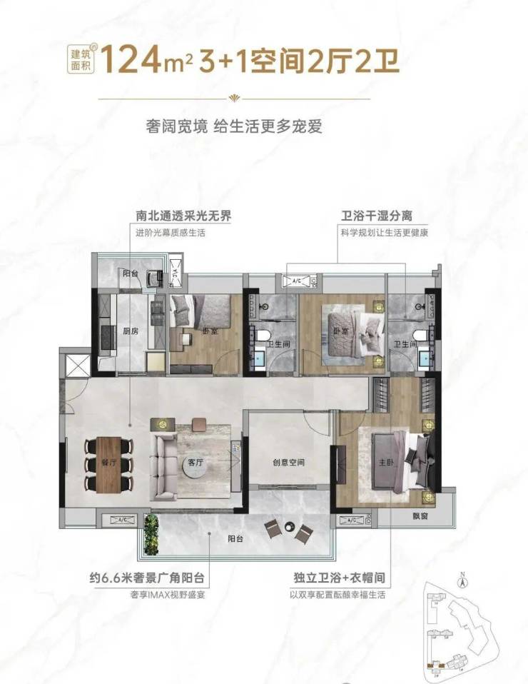 建面约124㎡3+1房,横厅设计,零过道浪费,特别适合二胎三胎家庭。