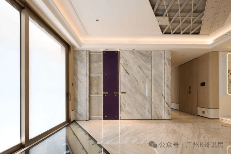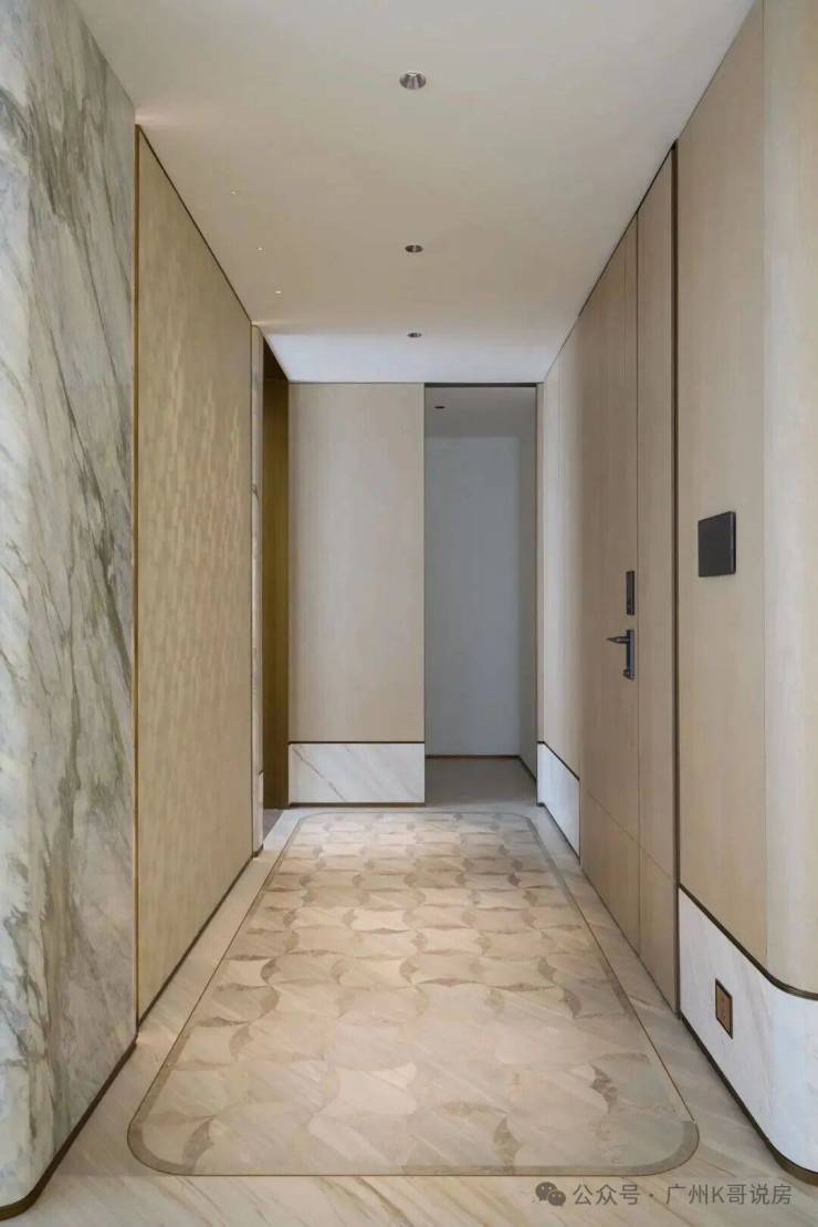 一进门的玄关地面,升级为宝珀灰+白慕斯石材拼花,仪式感拉满。