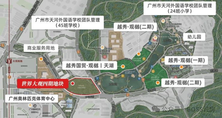 小学:配建 24 班小学,引进广州天河外国语教育集团合作办学,周边 3km 内有 15 个小学,包括奥体东小学、广州思源学校小学部等。