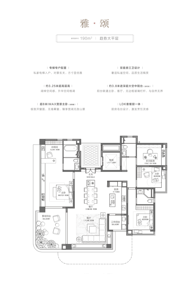 全能第四代住宅。阔绰楼间距,视野开阔,户户观山,户户观园。户型设计以空间享受型为主,三面采光、南北通风对流。每户均带入户花园满足入室清洁及收纳,户内格局方正,大开间,大景观阳台,IMAX主卧超宽景观,空间户型可随意设计调整。