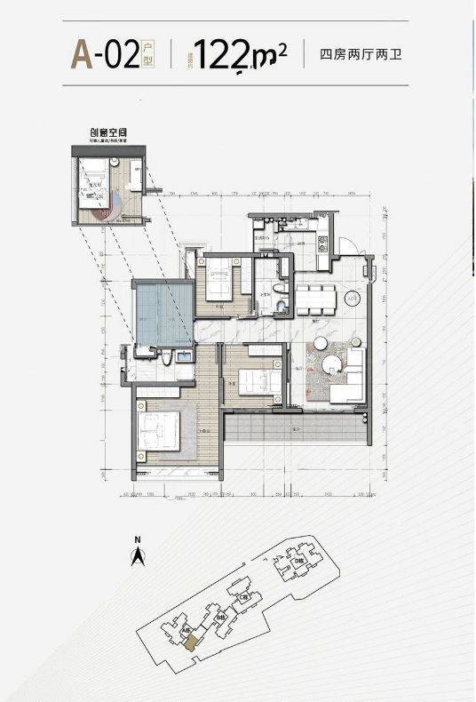 122㎡四房两厅两卫则偏向改善需求,总价约 612 万元 / 套,剩余少量房源,南向面宽充足,客厅空间宽敞,还带有独立的储物间,能满足多人口家庭的居住需求。