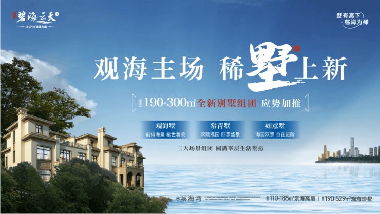 碧海云天,建面约190-300㎡三大别墅组团「观海墅、常青墅、如意墅」,此后难再有、难再藏。建面约110-185㎡亲海高层,精装交付,即买即住,全城热销中。