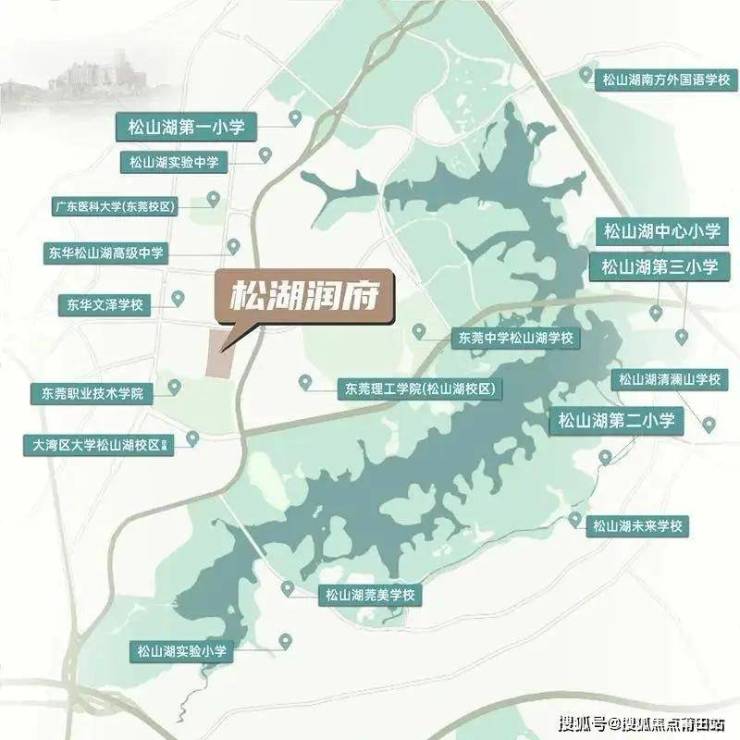 周边学校,包括松山湖中心小学、东莞中学松山湖校区、松湖一小、松湖实中、清澜山等13所重点中小学,以及广东医科大学(东莞校区)、大湾区大学松山湖校区(在建)等学府。