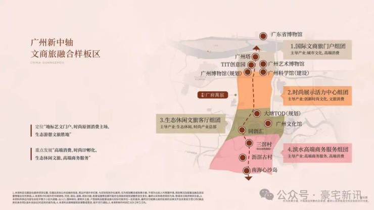 一轴三核规划,划分为四大板块:国际文商旅门户、时尚展示活力中心、生态休闲文旅客厅、滨水高端商务服务组团。国际文商旅门户已率先落地,1 塔 1 场 4 馆(广州塔、岭南广场、美术馆、文化馆、博物馆、科学馆)实景呈现。