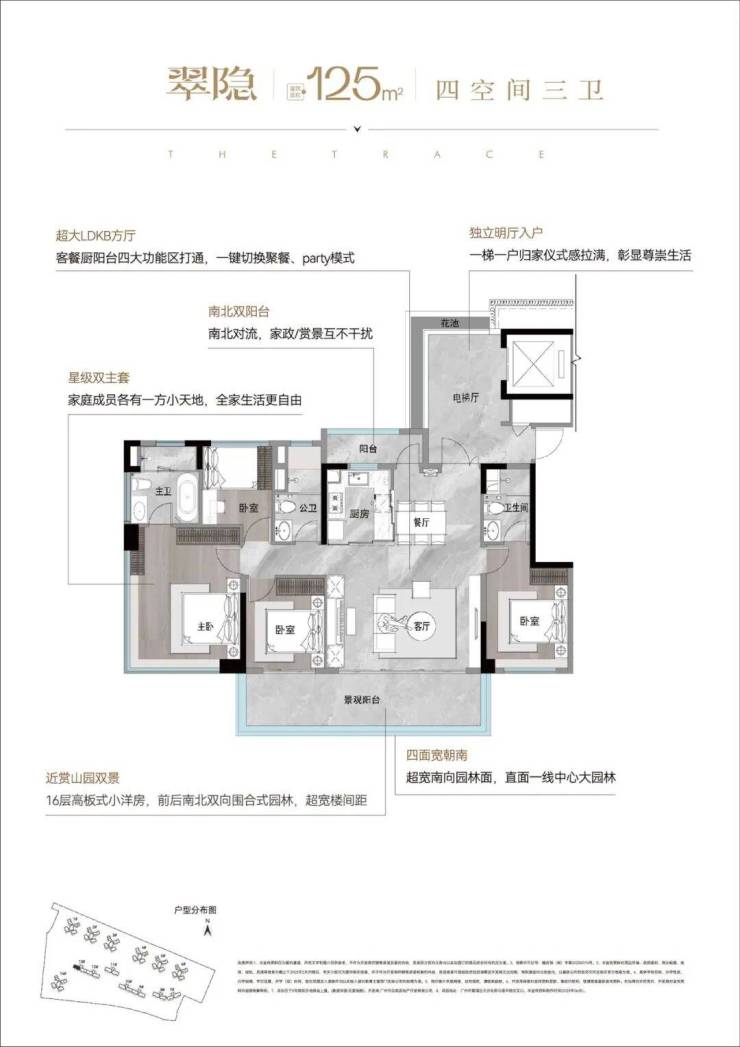 建面约125㎡,更是四房带双主套的板楼户型,拥有比肩豪宅的居住品质。