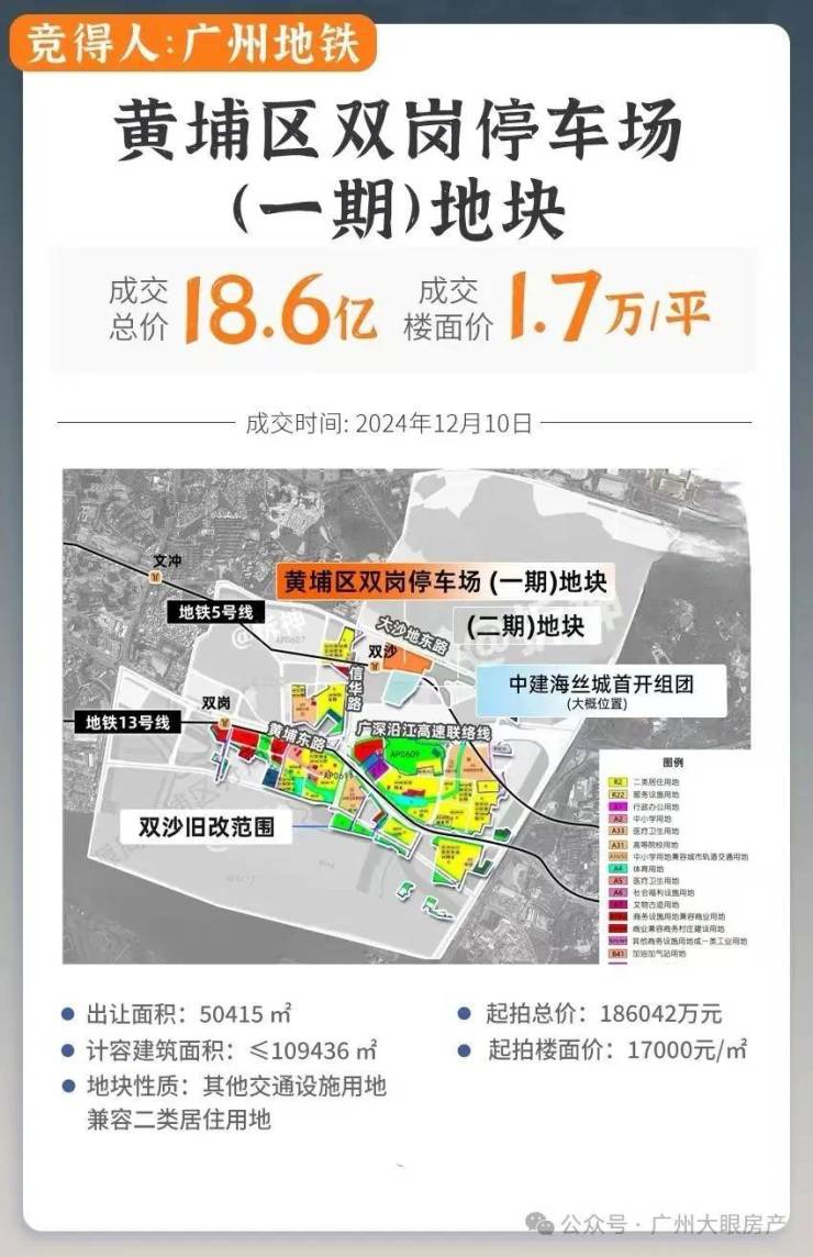 2024年12月10日,黄埔双岗停车场地块一期正式竞价,广州地铁以底价186042万元拿下,成交楼面价约1.7万/平。