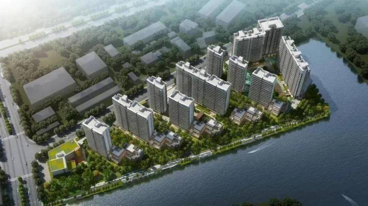 户型排布从石榴岗河自东向西依次升高,保证了约300米宽的生态水景面。