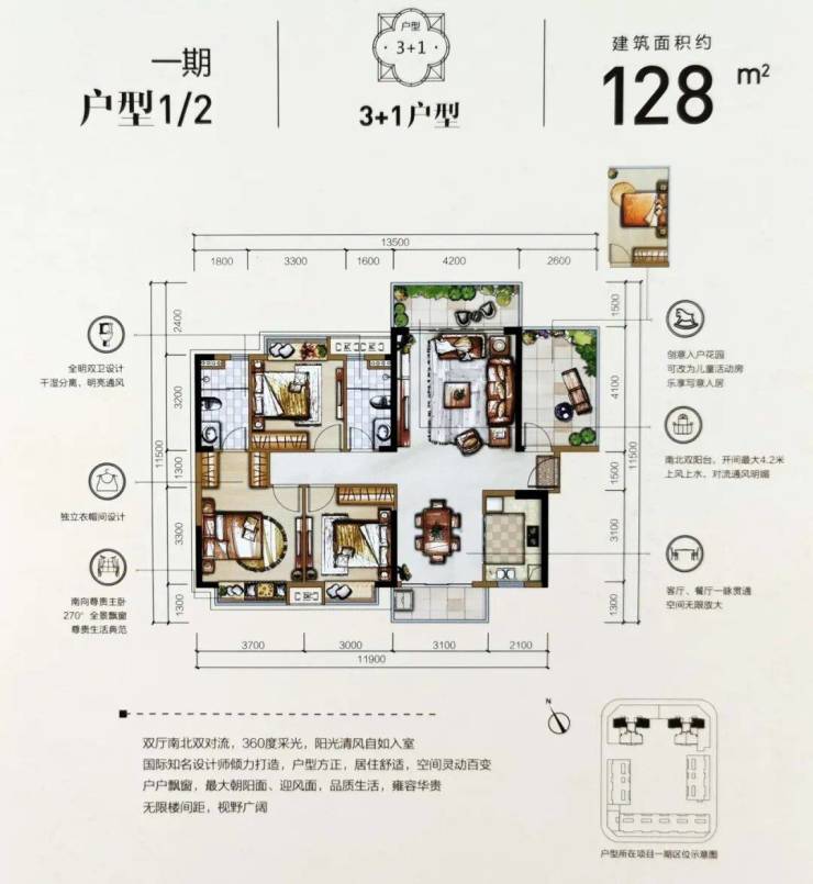 建面128㎡的四房对应的是1户型和2户型,双阳台设计保证了采光和通风,朝向都做到南北通透,这样居住起来是比较舒适的。