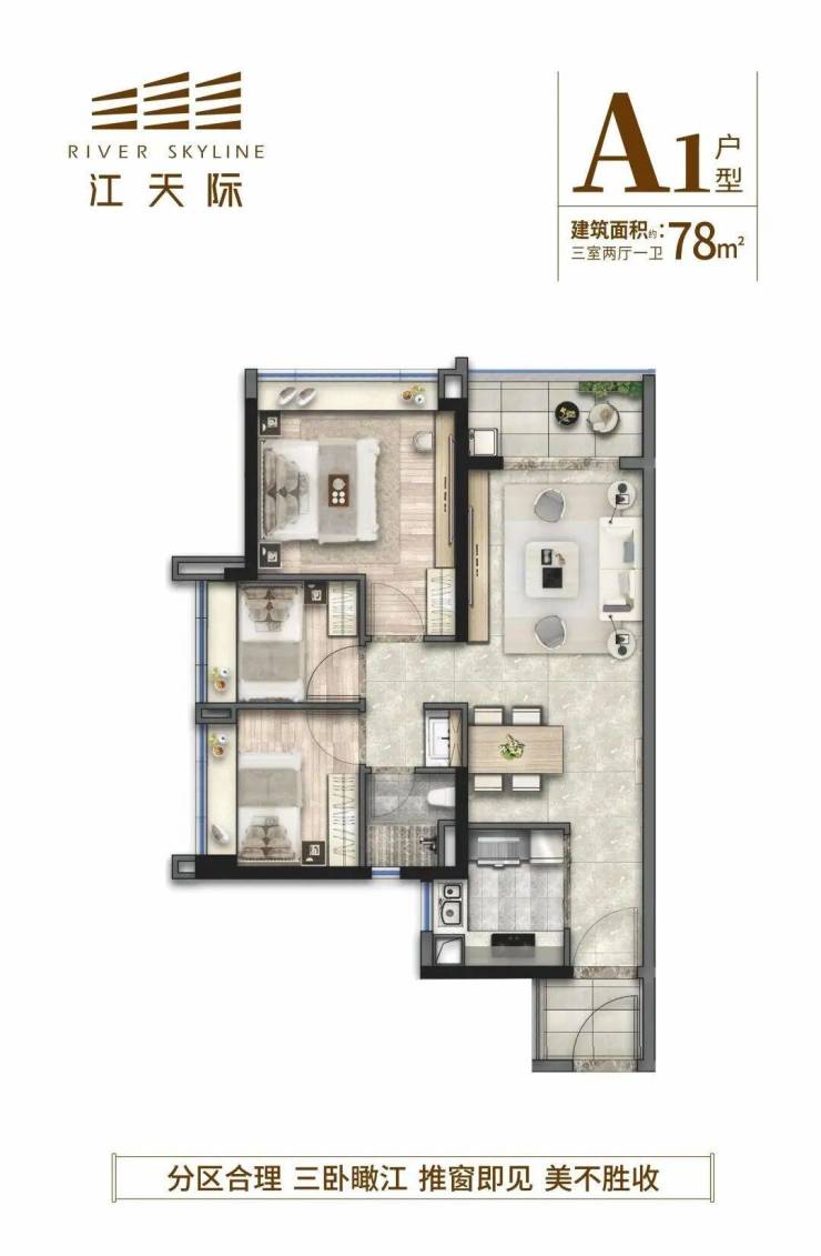 目前江天际除了A1、A4和B栋的商业,其它都在售中,住宅户型涵盖的面积段有78/88m²三房以及110/118/121/134/140m²四房。