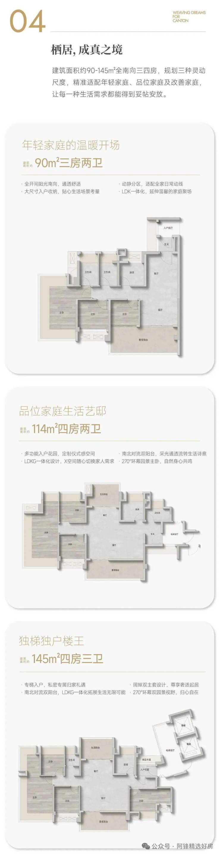 ②全南向设计,主打90-114-144㎡新规三四房。户型有不少亮点:层高3.05-3.15米、270°全面屏视野、LDK一体化、南北双阳台、X可变空间...