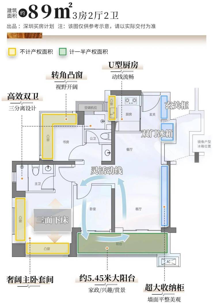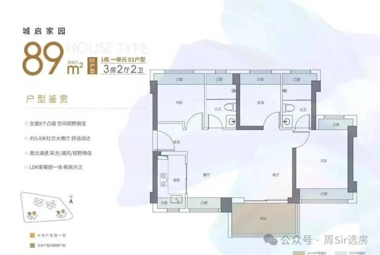 89㎡的3房2厅2卫,02.03户型,设计的是经典竖厅格局,客厅3.4米开间,LDKB一体化,S墙设计预留冰箱卡槽位,动静分区,三开间朝南,3个卧室分别做到了主卧13.79㎡/次卧7.62㎡/次卧6.93㎡(包含墙体飘窗),主卧+1个次卧270°飘窗设计,U型厨房,公卫三段式分离,客厅连接卧室出5.75米长的大阳台,得房率约87.2%(包含赠送),东南朝向。