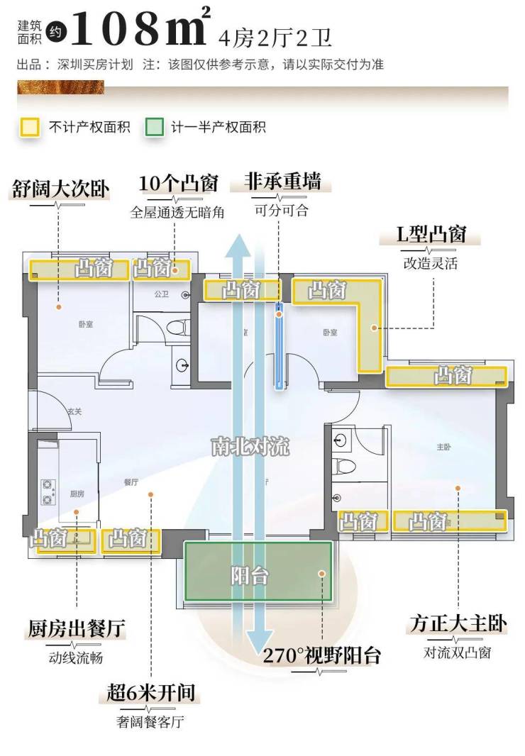108㎡的4房2厅2卫,设计的是横厅南北通透格局,进门独立玄关,客餐厅6.4米开间,LDKB一体化,五开间朝南,主卧双飘窗通透设计,全屋10个凸窗,4个卧室分别做到了主卧17.01㎡/次卧9.7㎡/次卧8.4㎡/次卧7.35㎡(包含墙体飘窗),L型厨房,卫生间干湿分离,得房率约91.88%(包含赠送),阳台主朝西南或东南向。
