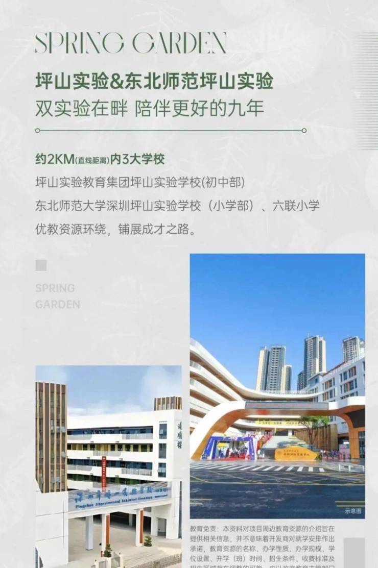 学校配套:春和府自带1所9班制幼儿园,旁边规划有1所九年制公办学校,根据坪山2024年最新的学区划分,小学学区划分在六联小学,东北师范大学深圳坪山实验学校组成的大学区,初中学区划分在坪山实验学校,东北师范大学深圳坪山实验学校组成的大学区。