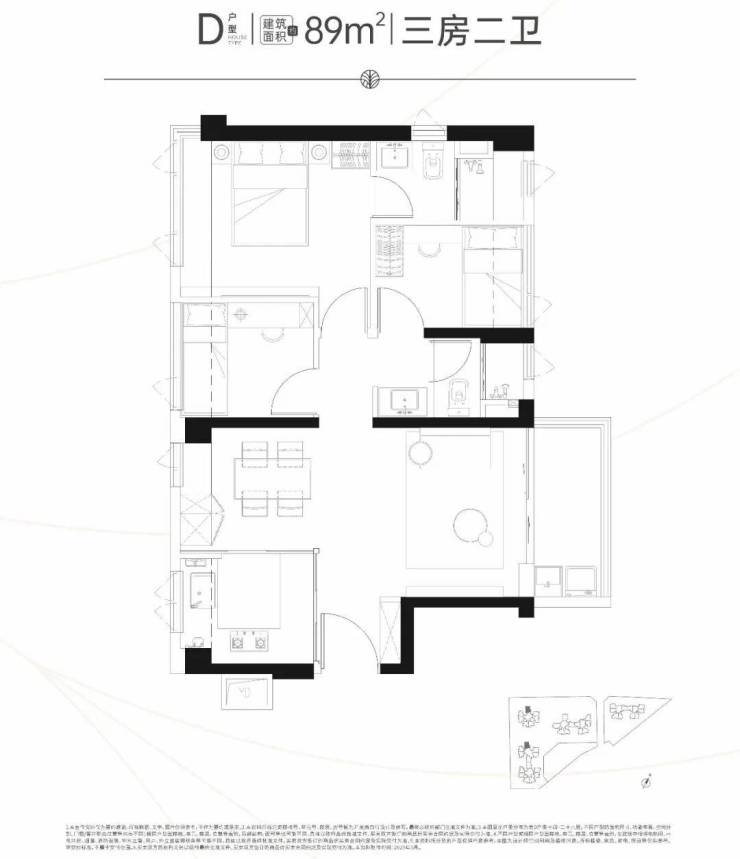 建面约89㎡的三房两卫户型不仅室内空间尺度更大,而且采光通风效果也非常好。