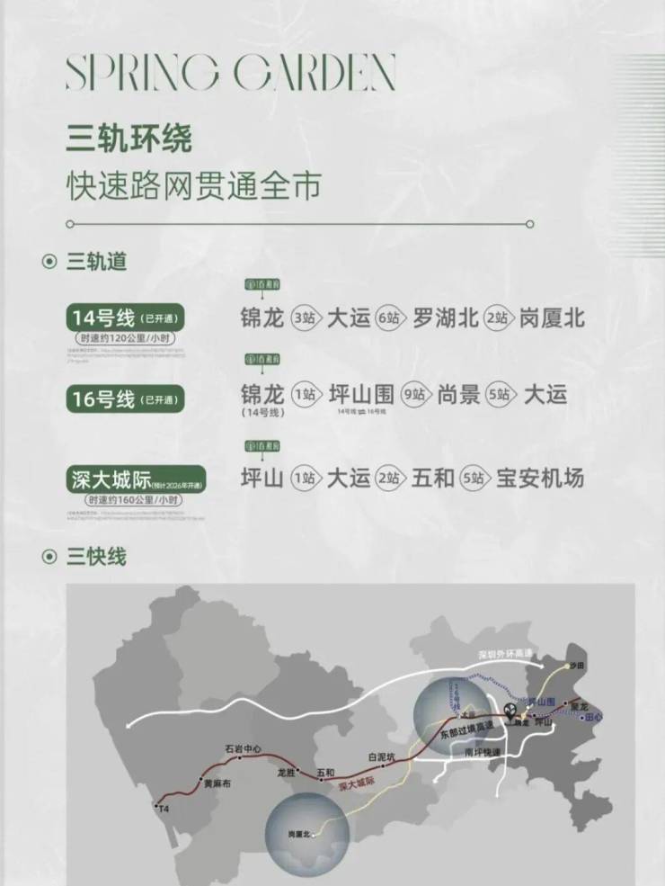 地铁配套:14号地铁线“锦龙站”距离约1.3公里,步行需要20分钟,该线路是从坪山沙田开往福田岗夏北的快速线,设计时速120公里,4站到大运,9站到布吉,10站到罗湖,12站到福田岗厦北,用时43分钟。