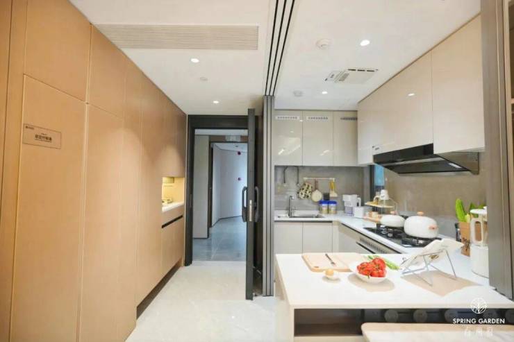厨房配备型推拉门设计,不仅能够达到餐吧、岛台的多种功能,打造陪伴式超聚厅,还能与客厅空间的交互,方便烹饪美食的同时也能照看玩耍的孩子。