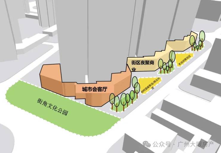 从流传出来的方案设计图,可以看到越秀采用了城市会客厅+街角文化公园+榕树要素,将打造老友闲聚街区、榕树温暖聚场等,确实很广府调调。