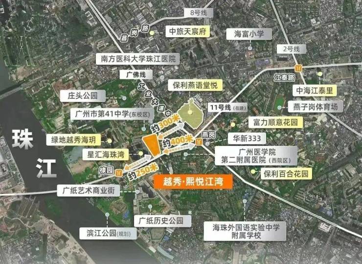 周边拥有双地铁:“换乘之王”广佛线燕岗站约400m(百度地图直线距离),广州首条黄金环城线11号线棣园站约250m(百度地图直线距离),直接打通琶洲、天河、海珠西和荔湾等区域,业主去哪都方便,7站南站、7站琶洲,轻松链接全城,虹吸广佛优质资源。