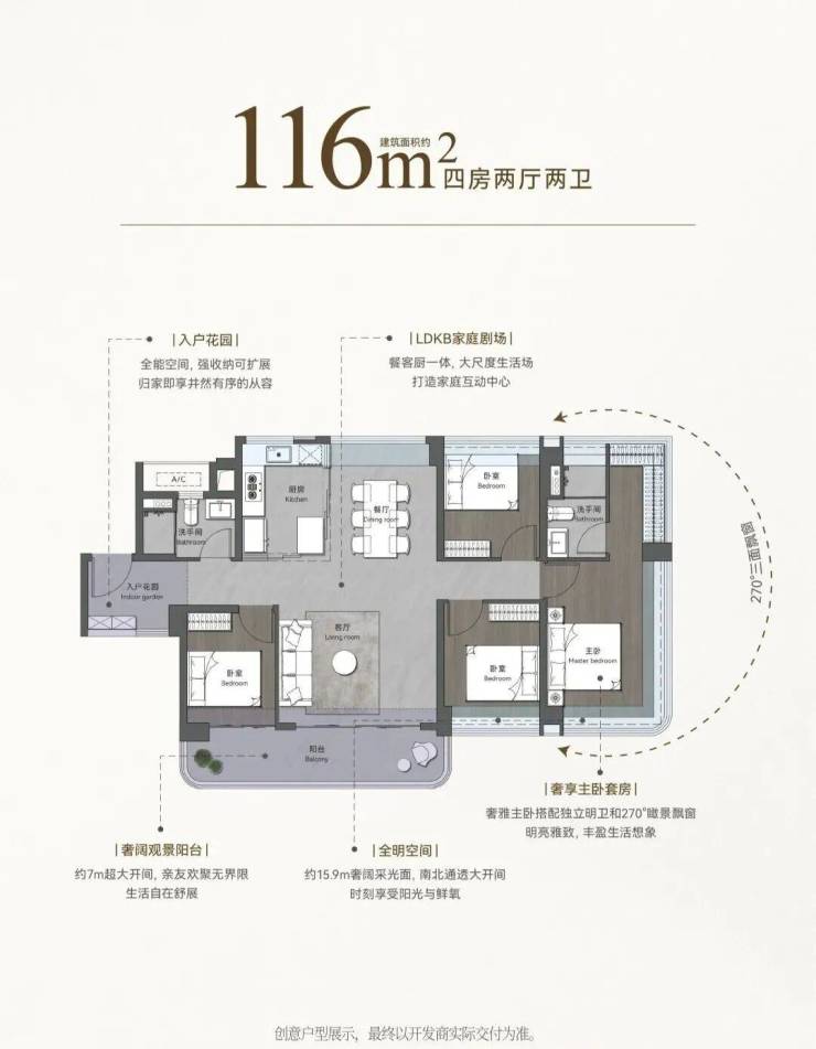 朝向:西南向16m超大尺度观景阳台,6.6m270°观景阳台,约30㎡超大主卧,270°全景飘窗