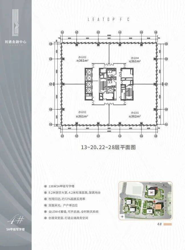 20米超高挑空大堂,标准层面积约1445㎡,4.5米层高,以不低于广州珠江新城CBD超甲级商务地标——利通广场的产品打造标准,再次为湾区钜献天际商务坐标。