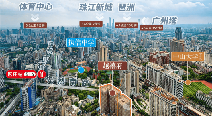 保隆越禧府位于越秀区环市东淘金板块核心位置,项目紧挨着先烈南路与执信中学为邻,周边的教育、医疗、商业、交通等配套设施非常完善,项目南向可远眺珠江新城东西双塔及广州塔的城市中轴景观,北向则背靠白云山龙脉一览白云山山景。