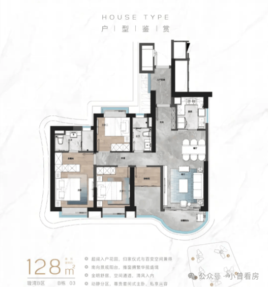 其中128㎡四房户型,南北对流,通透性好,配备约8.7米宽阳台,采光充足,厨电采用德国美诺六件套,满足日常烹饪需求,适合刚需改善家庭;