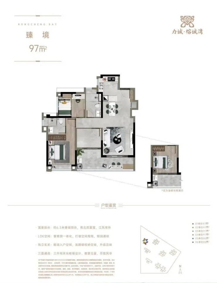 建面约97㎡,江园双景臻席,不仅能欣赏花地湾江面卓绝风光,还能俯瞰榕诚公园,以及GVL怡境国际匠心打造的“山林麓畔 隐翠森居”主题大师园林,LDK餐客厨一体设计,约6.5米宽境阳台。
