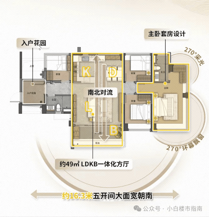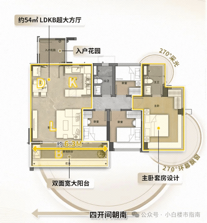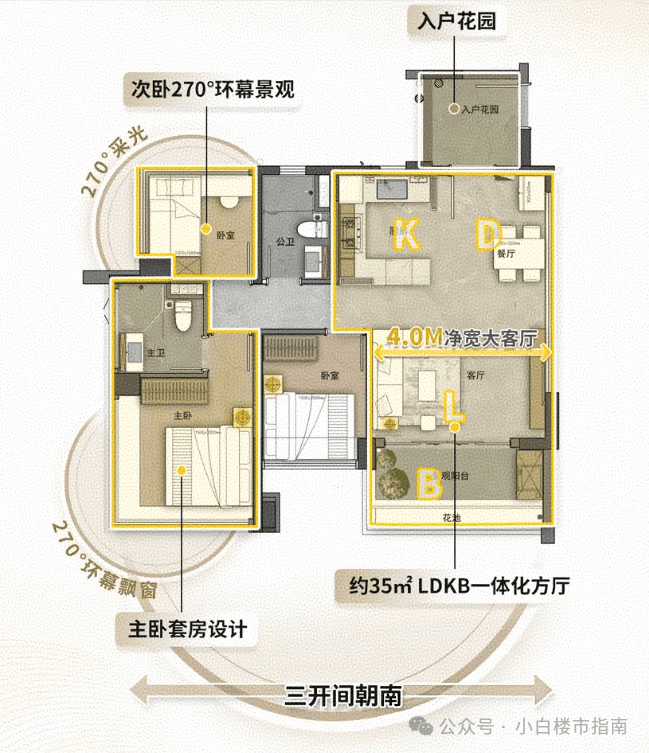 这个户型,入户花园、灵动大方厅、LDKB一体化、多开间朝南、270°环幕飘窗…好户型流行的元素,它都有。