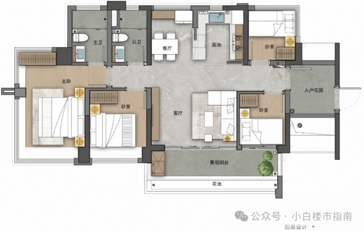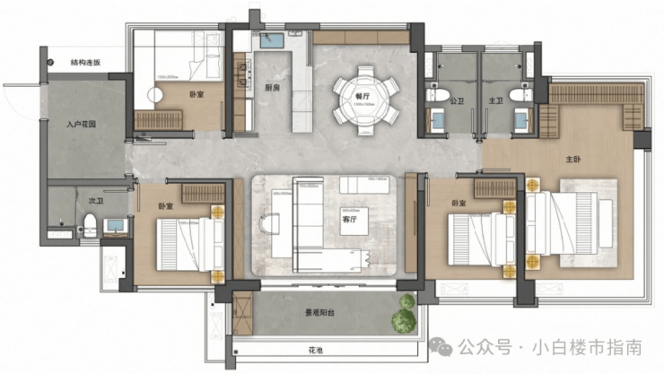 130㎡户型,可以做到5空间和双主套设计,把以往要160㎡以上才能做到的双主套用更少的面积做到了。