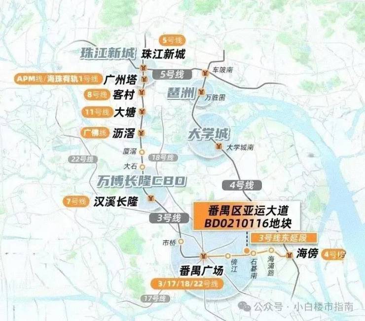 2站番禺广场:番禺广场5轨交汇,换乘18号线3站到冼村,换乘22号线2站到广州南站;