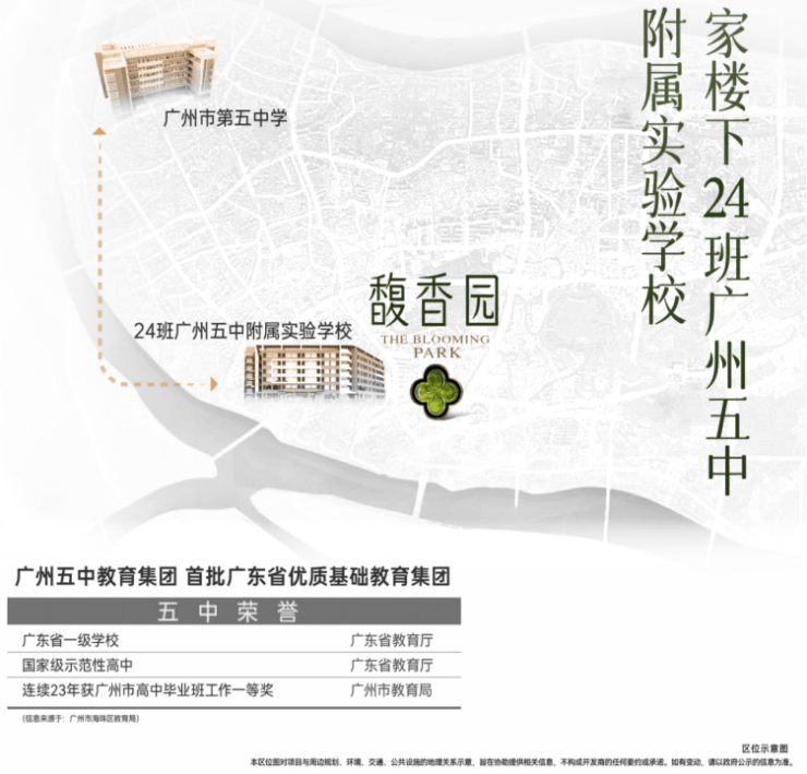 项目践行“住学一体”理念,红线内配建24班公立小学,由广州五中教育集团领办(直线距离500米),计划2026年开学。周边3公里内汇聚多所优质学校: