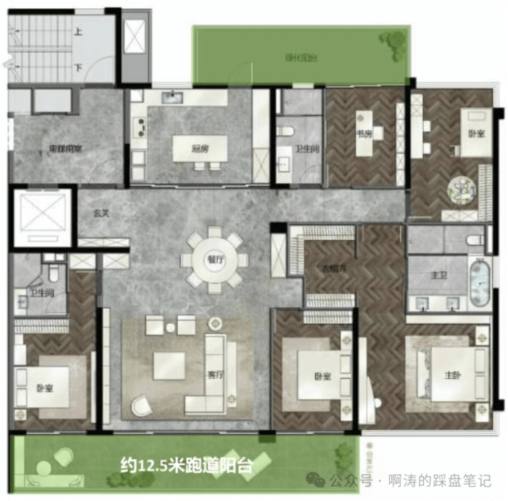 ·165平:常规飞机户型,双主套,南北双阳台,客厅、主卧都是南北对流,那个十字长中轴主卧,太气派!