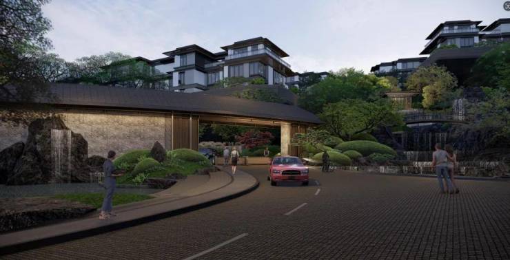 主入口为弧形环抱山门的形式,门楼挑高超4.2m,结合外界面围墙一体化设计,顶部浅金色铝板,花岗岩石材外墙和金属外墙结合,打造具有宋韵雅奢的山门坡屋顶门楼,结合跌瀑水景与点缀景石,营造了归家的礼序感和尊贵感。