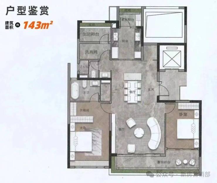 :拥有宽敞的客餐厅和独立书房,6米宽的景观阳台让自然光线充分照入室内,提升了居住舒适度。