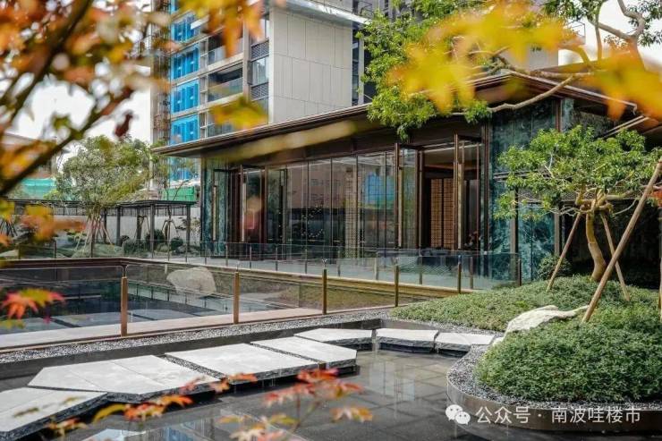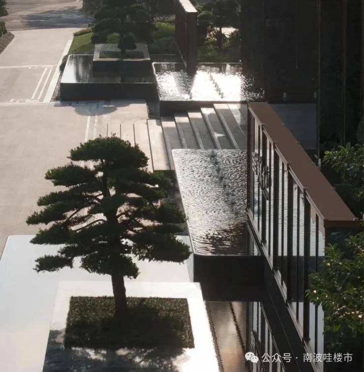 归家大门两侧以“百万级迎客松”为点缀,中间采用“泗水归堂”设计,搭配九阶石台阶、水景、多重檐口,气派奢华,岭南美学感扑面而来。