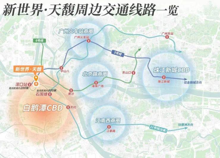 项目与5号线滘口站仅400米的距离,步行6分钟即可到达,12个站到达珠江新城,无需换乘,1个站换乘6号线以及11号线,去往越秀天河等广州核心区都非常方便,且地铁与项目之间还建了街区公园,为业主营造特有的归家仪式感。