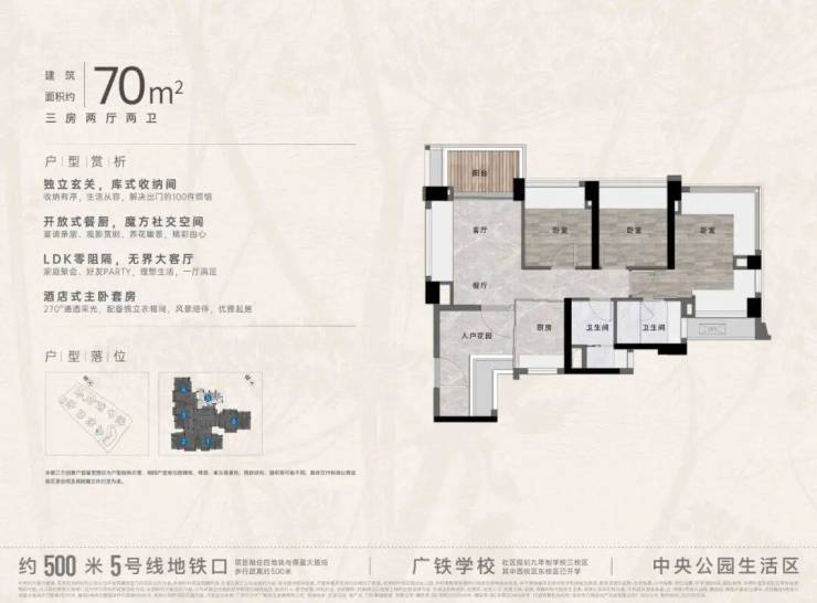 5、产品:户型王炸:超高得房率,70㎡做三房两卫
