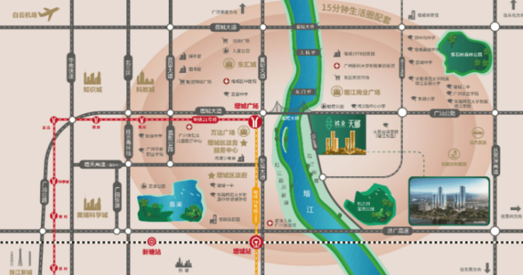 ⑤ 旅游:雁塔公园、增江画廊、鹤之洲湿地公园(项目旁)、增城广场(1.5km)、荔湖公园(2km)