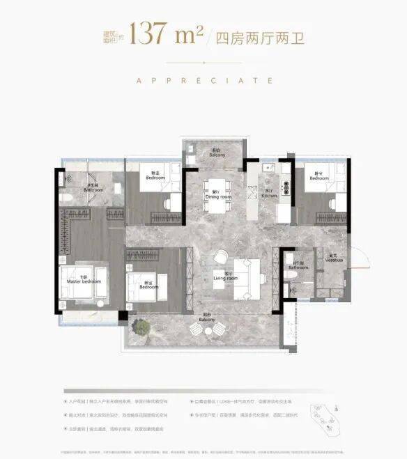 项目提供建面约103-186㎡的南向阔景四房户型,设计上强调无遮挡阔景视野和LDKB墅级阔厅,确保每户都能享有南向超大采光面。这些户型不仅使用率高达110%-120%,而且通过精心的设计实现了同等总价更大面积、同等面积更大尺度的效果,满足了改善型居住的需求。