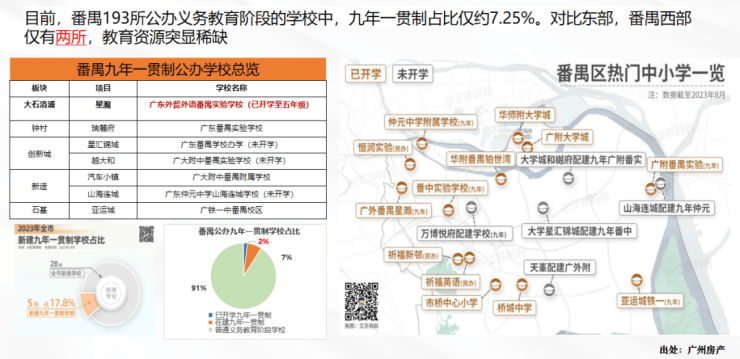 社区内学校:社区内配建27班公办幼儿园和45班九年一贯制公办广外附,均已开学(具体招生条件、招生范围及开班数量以教育部门公布为准)