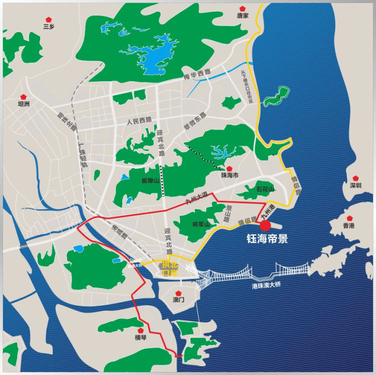 项目紧邻港珠澳大桥,快速通达澳门、香港。毗邻城轨珠海站,转瞬即达中山、广州、佛山等城市,广澳高速、广珠西线高速通达珠三角半小时生活圈。