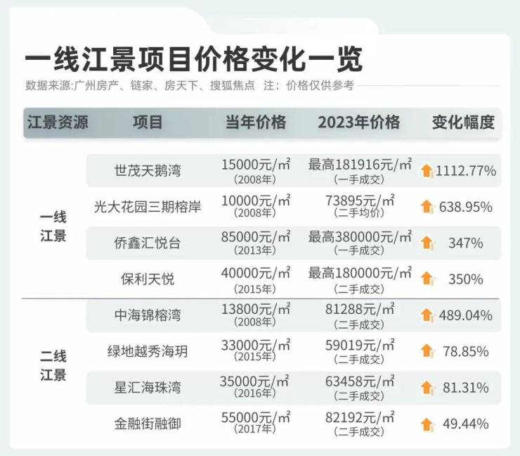 据统计,2013年至今,广州仅出让9宗临江地块,稀缺程度可想而知,江景豪宅价格变化幅度高达1112%。