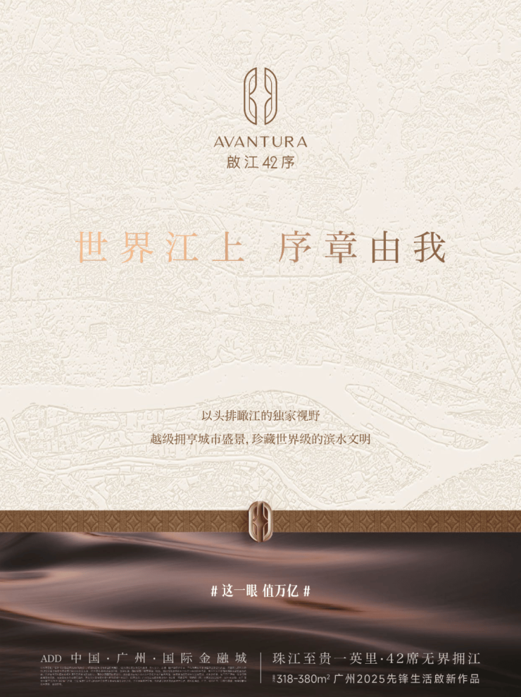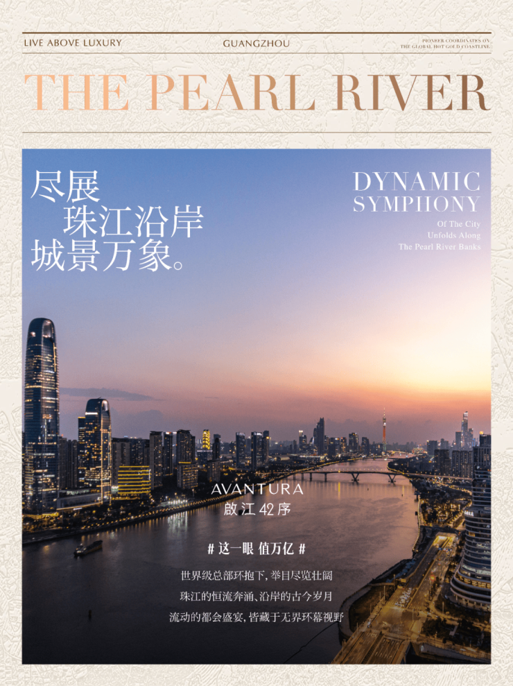 Live Above Luxury——与时代前进的脉动共振与城市巅峰的光辉对望私藏江心上的自然诗意尽展珠江沿岸城景万象 头排瞰江,谨此42席由此打开城市全貌视野这一眼,值万亿啟江42序·AVANTURA珠江至贵一英里·42席无界拥江建面约318-380㎡广州2025先锋生活啟新作品