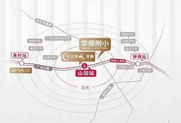 距21号线山田站D出口直线距离约50米,快线6站天河,3站黄埔。