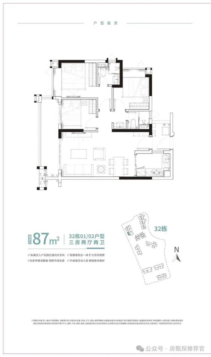 此次广地花园·观灏加推的新品32栋悦景楼座,面积段分别为86m²、96m²、100m²悦景三房,多面采景,三面望水,通透采光,充分利用户型的每一寸肌理,以有限的生活空间焕发更多生活灵感,打造全方位人性化居所。