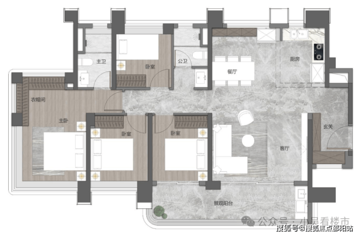 建面116平四房两卫,这个户型没有做板房,相当于138的缩小版,也是超宽阳台和客厅,主卧L型大飘窗,景观也比较好。
