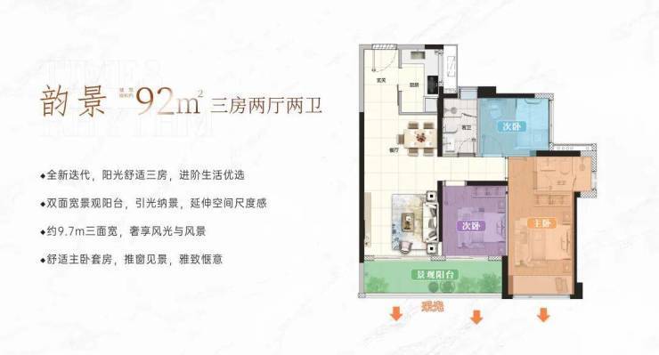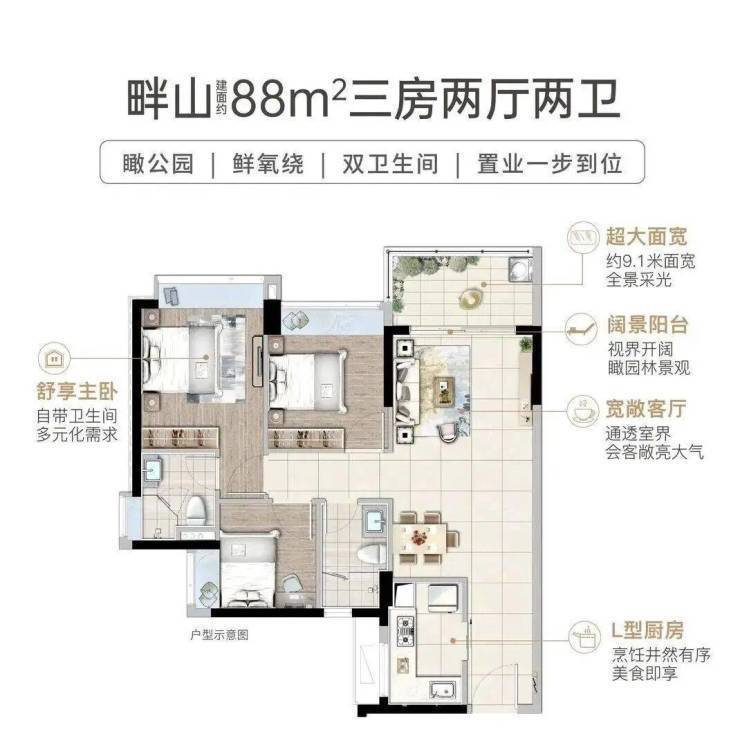 建面约92㎡三房两卫,舒居优选·阳光生活空间