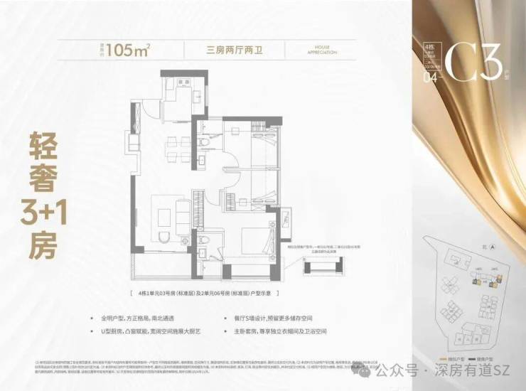横厅南北通透格局,客餐厅6.6米开间,四开间朝南,主卧套房设计,6.6米超长观景阳台,得房率约72.45%(不含赠送),阳台主朝正南向。