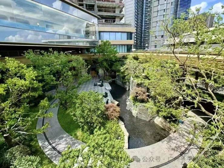 华樾小区园林秉承“外得江湖、内得山水”的造景理念,将传统园林的空间手法转移到园区内部,形成营山置水、建廊种树、以小见大、造廊架桥、堆山引水的前庭后园,再依托层层退台的建筑形态打造山水园林景观。